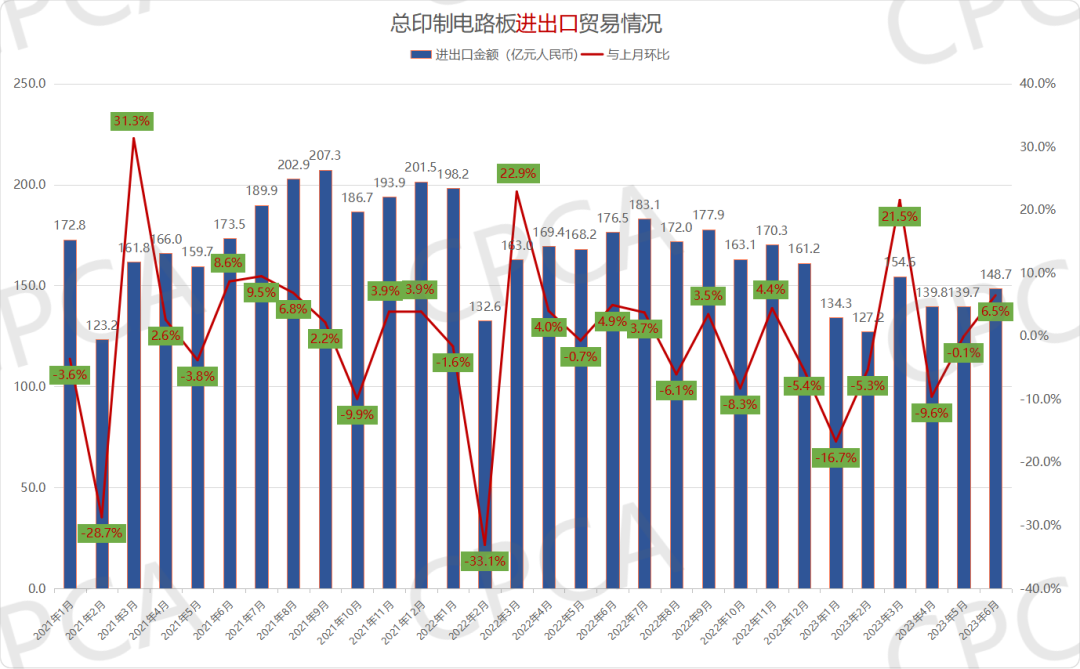 图1 2021年1月-2023年6月中国印制电路板进出口贸易情况(按月)
