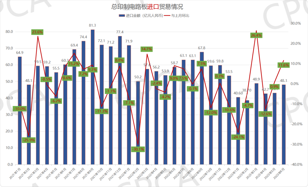 图2 2021年1月-2023年6月中国印制电路板进口贸易情况(按月)